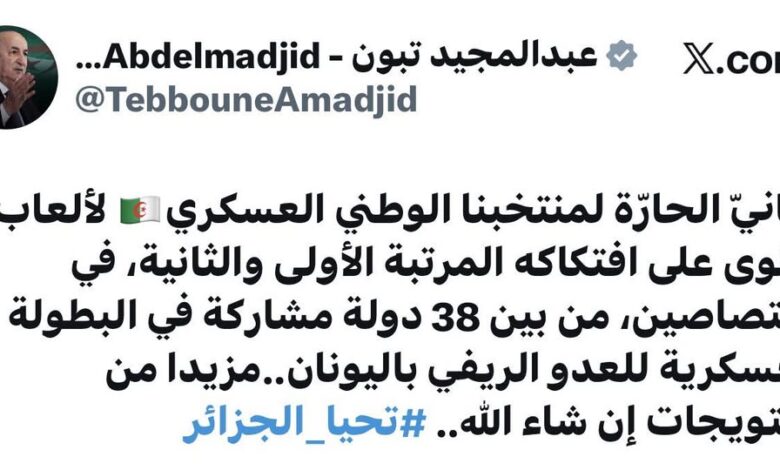 وكتب رئيس الجمهورية عبر حسابه الخاص على مواقع التواصل الاجتماعي: “تهاني الحارة لمنتخبنا الوطني العسكري لألعاب القوى على افتكاكه المرتبة الأولى والثانية, في اختصاصين, من بين 38 دولة مشاركة في البطولة العسكرية للعدو الريفي باليونان. مزيدا من التتويجات إن شاء الله. تحيا الجزائر”.